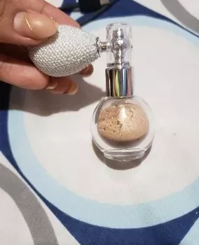 The product has a baby powder scent, but it works well otherwise. It's a bit more powdery than I expected, yet still delivers a nice shimmer.