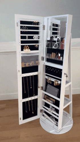 Discover the ultimate solution to your jewelry organization needs with our Full Length Mirror Jewelry Armoire. This innovative 3-in-1 design combines an integrated jewelry armoire, a full-length mirror, and ample storage shelves, offering endless dressing up fun. Crafted with high-density MDF and finished with high-level painting technology, our jewelry cabinet is not only aesthetically pleasing but also moisture-proof, corrosion-resistant, and wear-resistant.