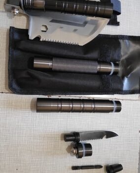 My trusty tri-fold shovel won't stay straight anymore, so I was in the market for a new shovel. I do a lot of dispersed camping and you know what that means! I dig a hole at least once a day. This shovel has been perfect so far - very sturdy and due to the rubber washers it stays solid when in use. I tried the farro rod (or flint and steel) and it makes a great spark. Overall, very decent product. Looks cool too.