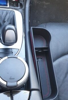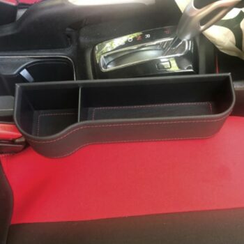 Our Multifunctional Car Seat Organizer fits into the space between your car seat and center console for an out-of-the-way storage accessory that also is conveniently within reach. Our Multifunctional Car Seat Organizer features a coin holder, curved spot to hold a tumbler or drink, and even built-in ports to facilitate flow of charger cables for devices. Plus, a luxe black, expert-crafted PU leather design (with visible red stitching detail) adds a stylish touch that blends into just about any car interior. Above all, our organizer is easy to install: just insert into the space between your seat and center console — no drills or attachment clips required. It’s a high-crafted solution to help tidy up your ride.