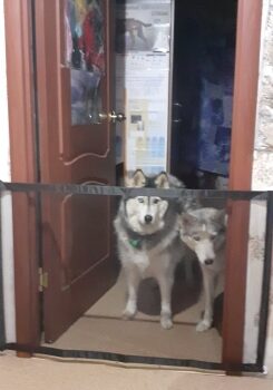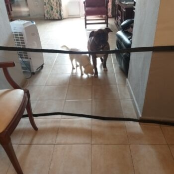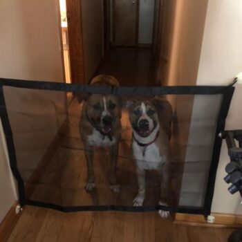 It’s easy to store since it’s flexible and takes up way less space than a baby gate. It holds back my dogs and is very easy to install onto any door or pathway.