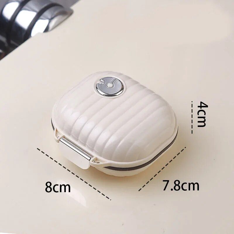 While designed as a travel case, I've found that this pill organizer also effectively keeps humidity out. The exterior resembles a hard shell makeup holder and boasts a cream-colored finish. Its larger exterior may make it less ideal for traditional travel use compared to standard pill holders.